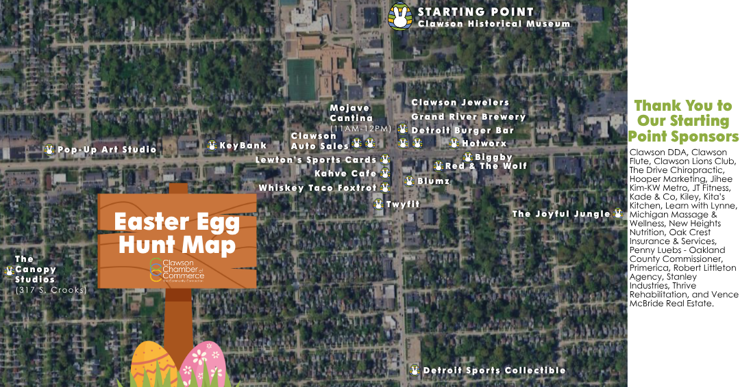 Hop into spring with a free Easter Egg Hunt hosted by the Clawson Chamber of Commerce! On Saturday, April 4th, from 10 AM to 12 PM, the Easter Bunny will be hiding eggs at businesses throughout Clawson.